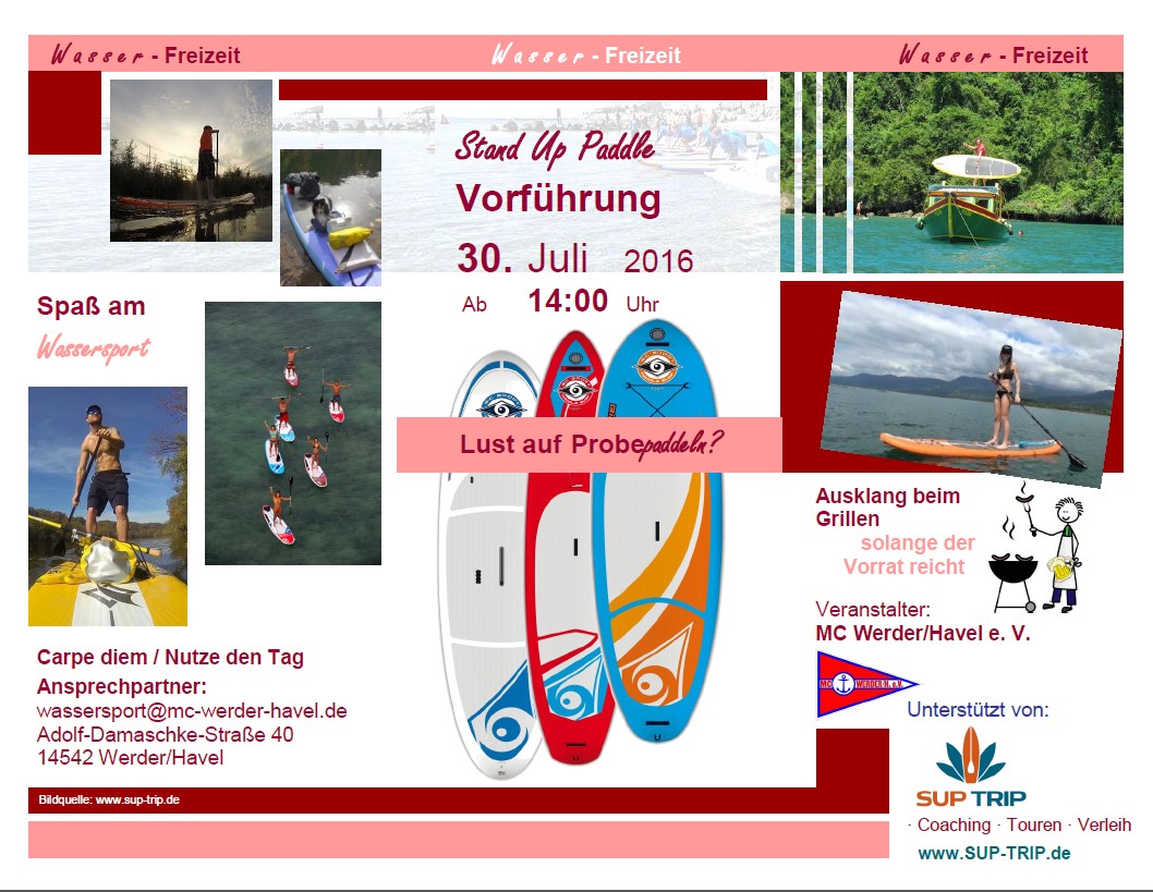 Am 30.7.2016 veranstaltete der McWerder nach 2015 die zweite Stehpaddel-Veranstaltung für Vereinsmitglieder und die wassersportbegeisterte Öffentlichkeit von Werder und Umgebung. Die Resonanz ware dismal deutlich höher als im letzten Jahr, mit vielen Versuchen, auf diesem wackligen Sportgerät zurecht zu kommen.