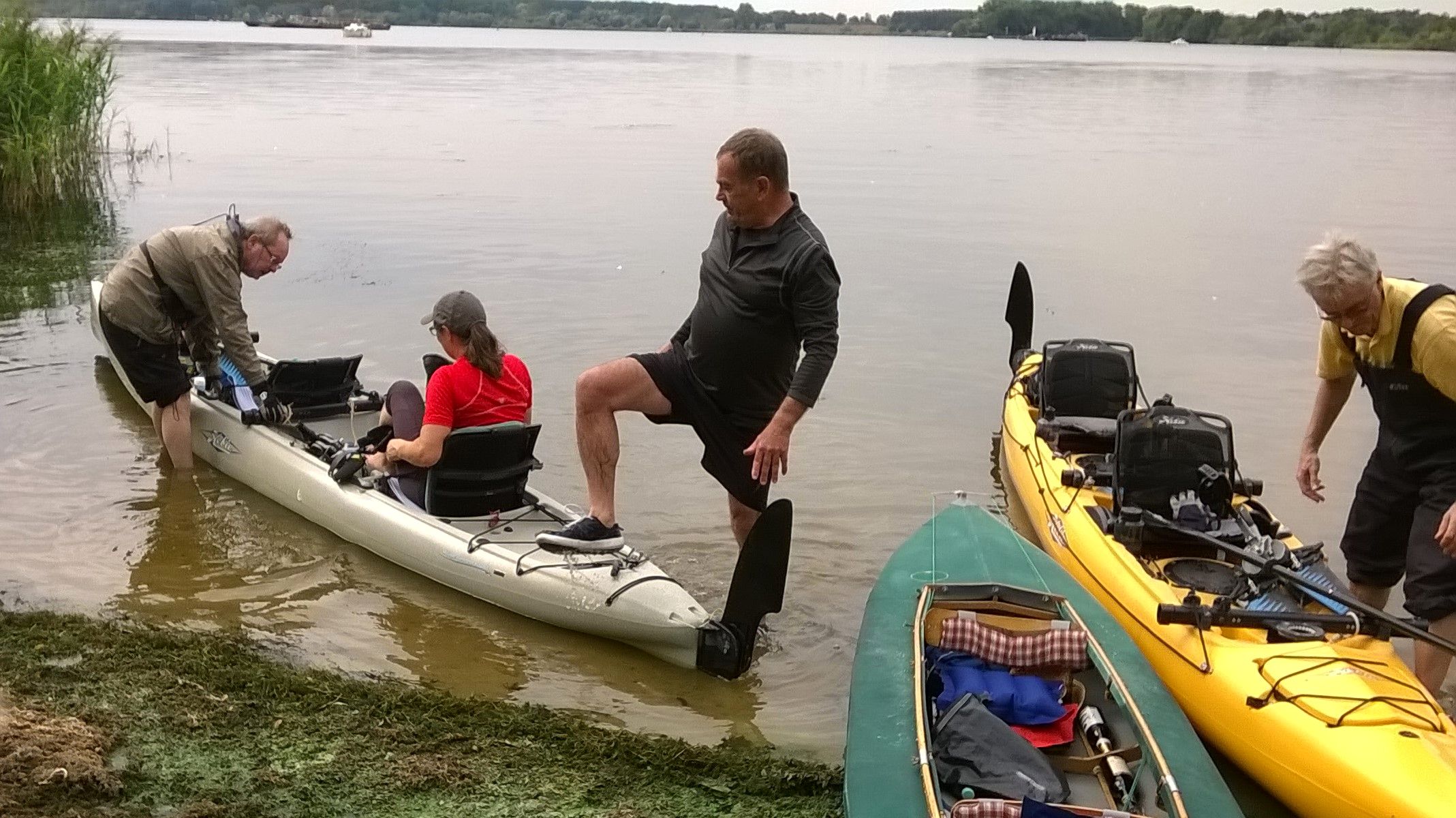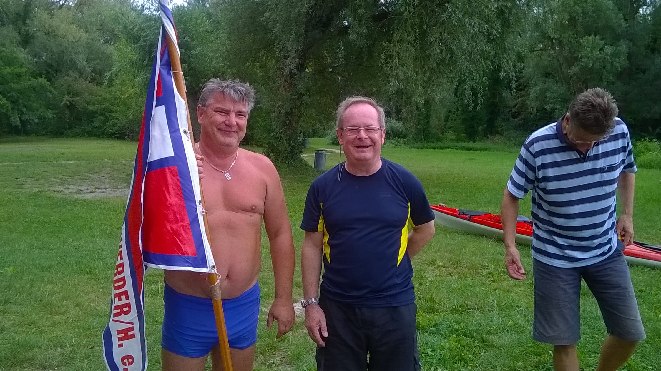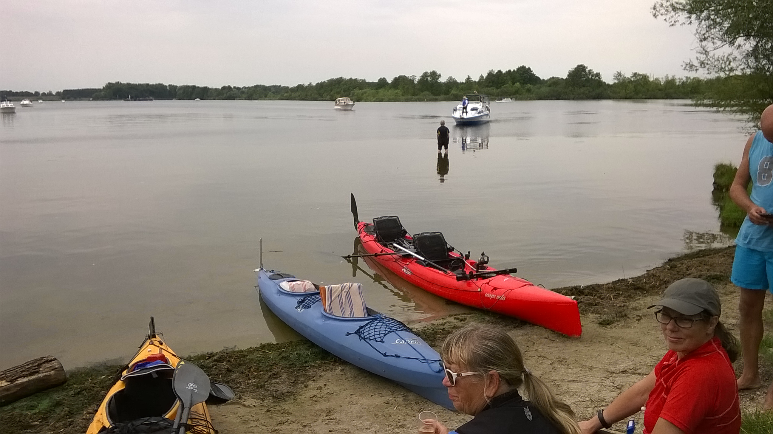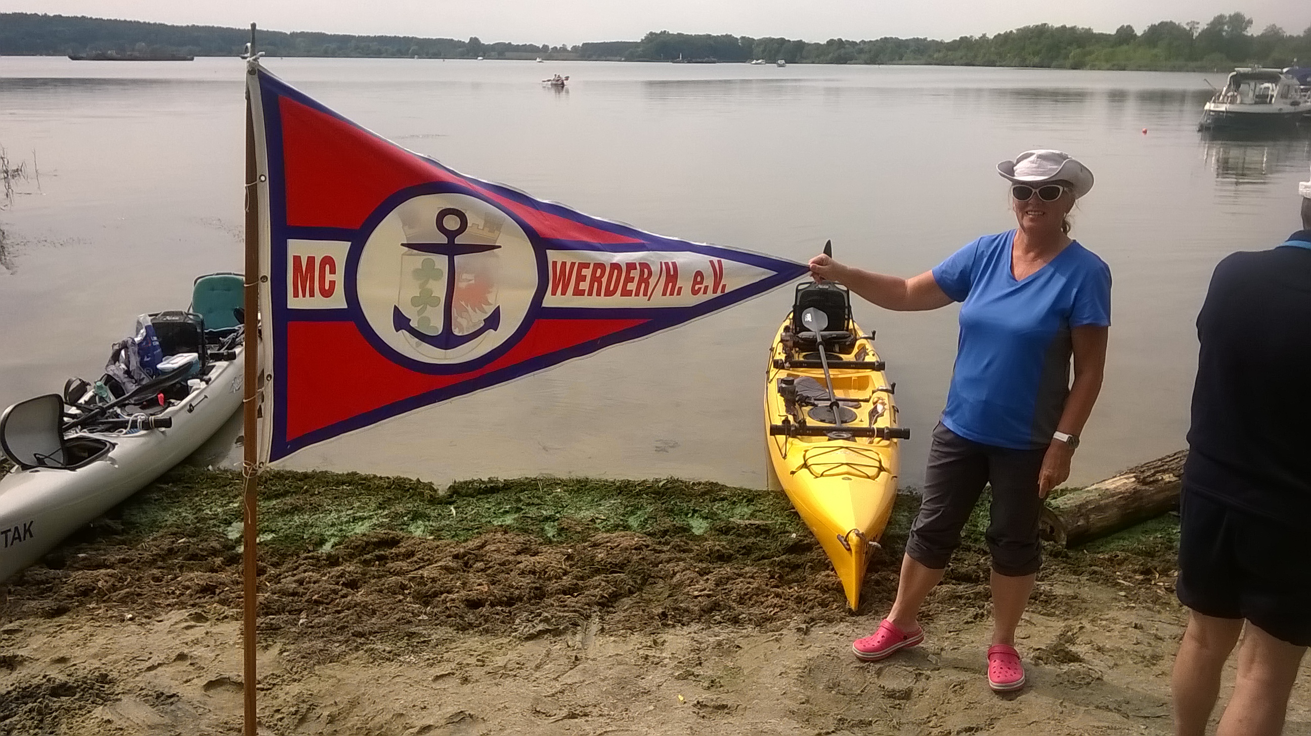 Diese Worte sind wie ein Jungbrunnen und wirken Wunder. Adrenalin schießt plötzlich wieder durch die Muskeln. Es wird gepaddelt, getreten, gehofft. Jeder will der Erste sein. Unter gegenseitigen Anfeuerungsrufen nähern wir uns unaufhaltsam den unbekannten Ufern von Marquardt. Wir springen aus den Booten und waten stürmisch an den Strand. Derjenige von uns, der das Banner des MC Werder in den Sand rammt, nimmt das Land für uns in Besitz. Die am Strand anwesenden einheimischen Marquartdianer haben sich inzwischen gesammelt und etwas verstört vom Ufer ins Landesinnere zurück gezogen.