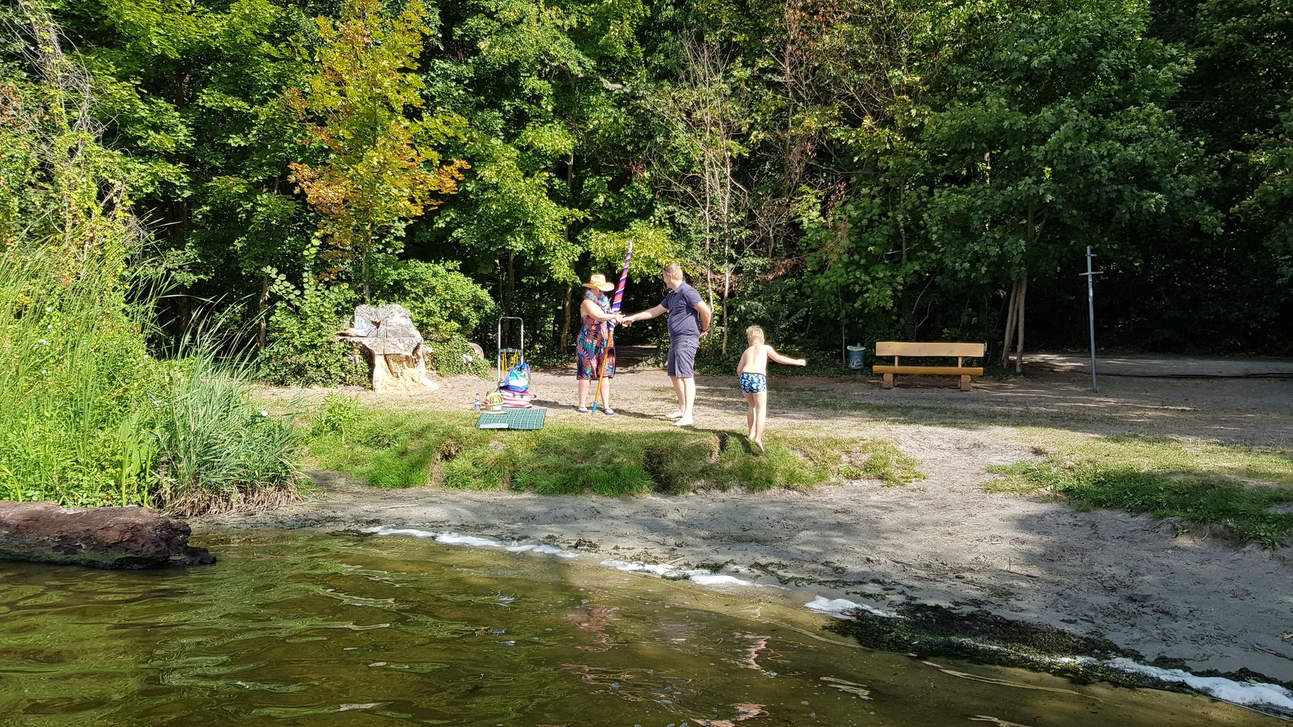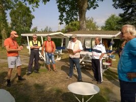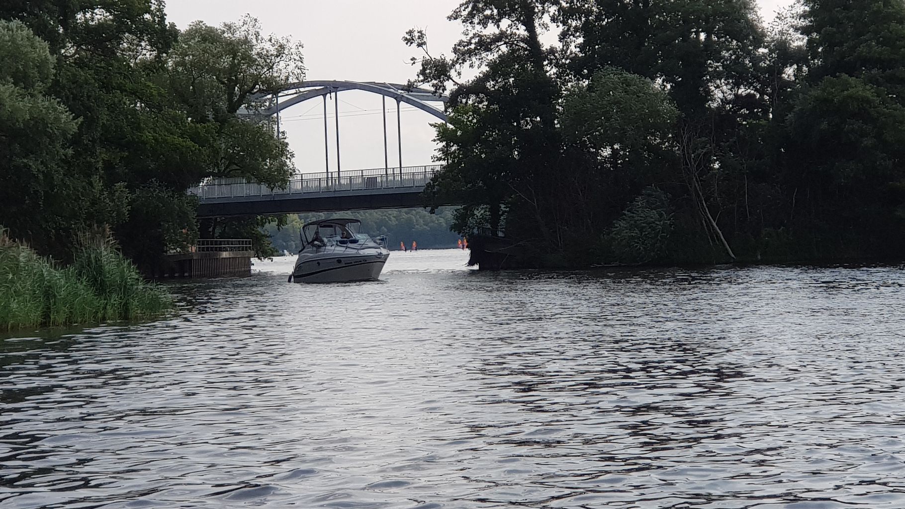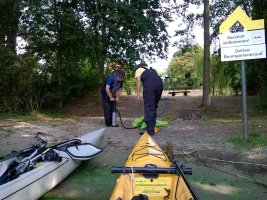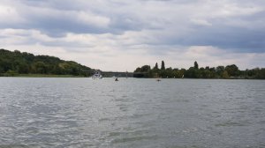 MuK: In der Ferne erblicken wir das Kap "Baumgarten Brück". Dieses gilt es zu umfahren. Noch gehorchen die muskulösen Paddler und Treter. Was aber hinter dem Kap liegt, ist meines Wissens noch nicht erforscht und kartographiert. Dass die Erde rund sein soll, das habe ich gehört und setze die Mannschaft davon in Kenntnis. Harald meint, - sein Beitrag hebt die zuletzt etwas gesunkene Moral -, dann müssten wir wohl nicht mehr so angestrengt treten und paddeln, weil es ja bergab gehe. Gerade noch zur rechten Zeit!