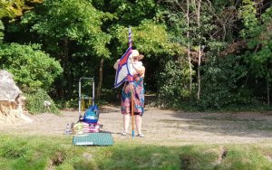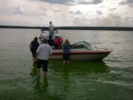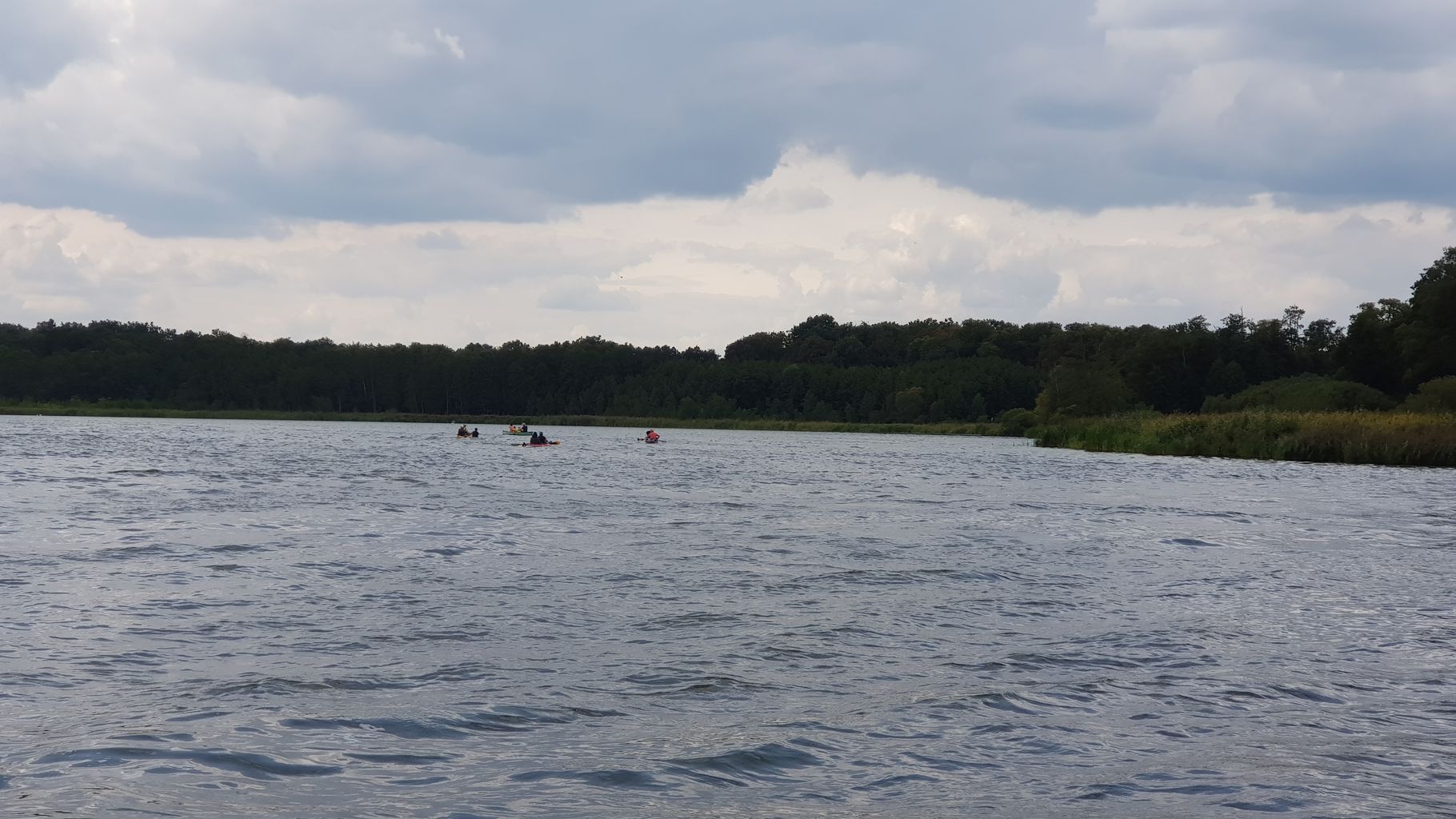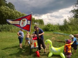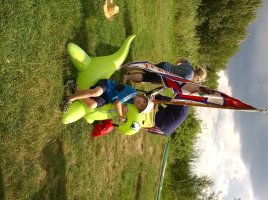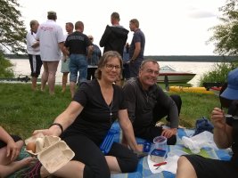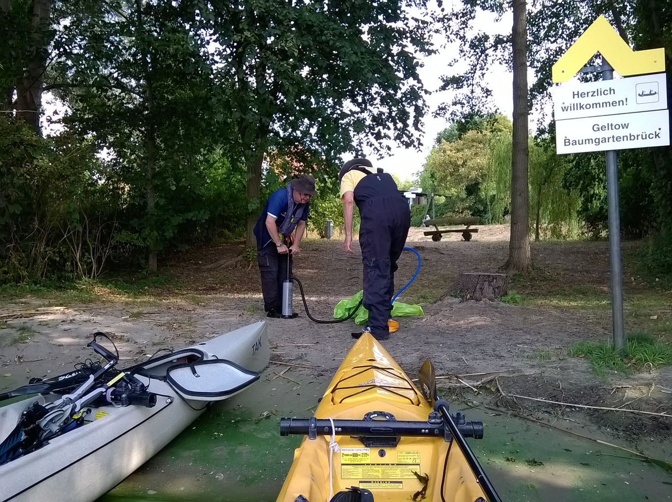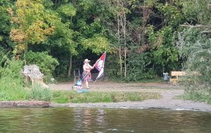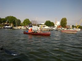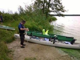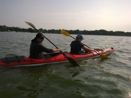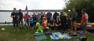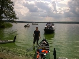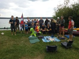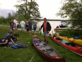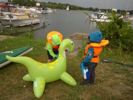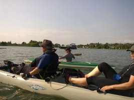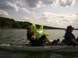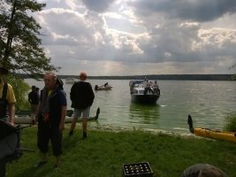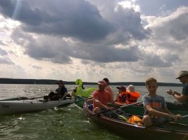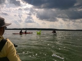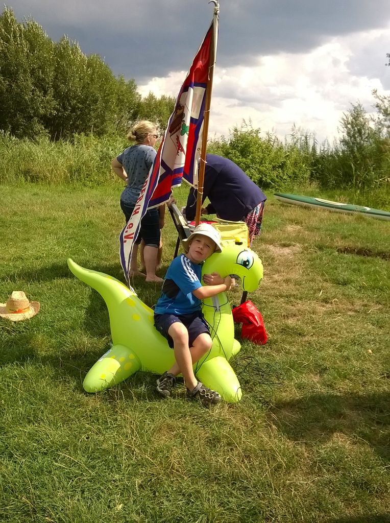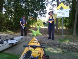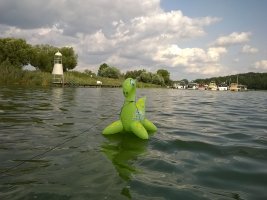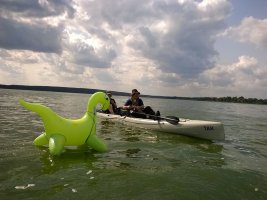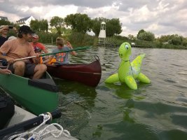 MuK: Die Fahrt in der Neuen Welt verläuft bisher ohne Vorkommnisse. Allerdings wird die See langsam unruhiger. In dunkler Vorahnung spüre ich, dass Gefahr in der Tiefe lauert. Die Wasser werden bedrohlicher, verdunkeln sich und unberechenbare Wasserwirbel entstehen. Ich lasse die Boote ausschwärmen; wir nähern uns in einer Zangenbewegung der Gefahrenstelle. Alle sind bereit. In der Tiefe entsteht plötzlich Bewegung ; mit unheimlichen Lauten nähert sich rasend schnell ein großer Schatten der Oberfläche. Ein Wasserdrache, wie wir starr vor Angst erkennen. Der grässliche Kopf sticht aus dem Wasser, in Panik schlagen die Paddel zu, durch den Kopf geht ein Ruck und ein plötzlich sehr benommener Drache schaut uns mit leutseligen Augen verwirrt an. Nach kontroversen Beratungen entscheiden wir uns gegen den Zweitschlag und nehmen den Drachen ins Schlepptau. Durch ein immer wieder drohend erhobenes Paddel wird ihm aber präventiv und visuell unsere entschlossene und schlagkräftige Wehrhaftigkeit verdeutlicht.