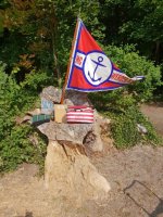 MoK: Nach den Koordinaten haben wir es nicht mehr weit. Kurs NW. Westlich vor uns liegt eine schmale Einfahrt in ein vor Wind und Wellen geschütztes kleines "Seeparadies". Vorsichtig passieren wir die Zufahrt. Zur Sicherheit lasse ich ständig messen, ob wir genug Wasser unterm Kiel haben. Langsam fallen wir nach NO ab. Durch das Rohr sehe ich plötzlich an einem einsamen Sandstrand eine einsame Person in erbärmlichem Zustand. Diese hat sicher auch schon bessere Tage gesehen. Aufmerksam prüfen wir die Umgebung, dann lasse ich ein Beiboot zur Übernahme dessen aussetzen, was im Lager noch gesichert werden kann. Wichtig ist mir vor allem die Fahne des MC Werder, die ich auch am Strand entdecke.