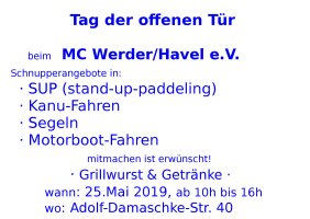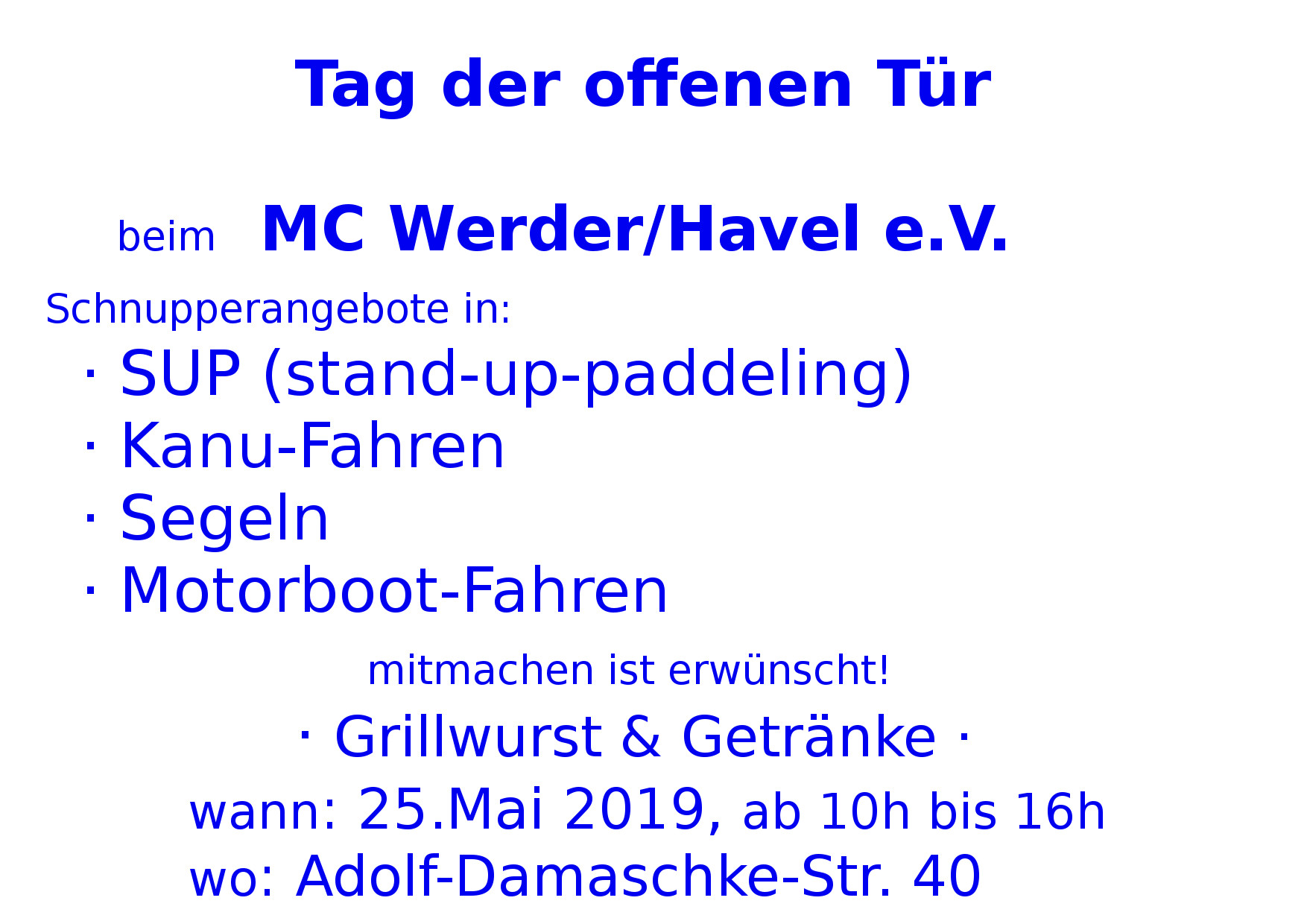 Am 25. Mai 2019 von 10 bis 16 Uhr auf dem Vereinsgelände des MC Werder/Havel e.V. Adolf-Dadmaschke-Str. 39a