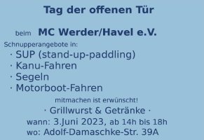 Am Sa 03. Juni 2023 findet der Tag der offenen Tür von 14 bis 18 Uhr auf dem Vereinsgelände des MC Werder/Havel e.V. Adolf-Damaschke-Str. 39a statt.