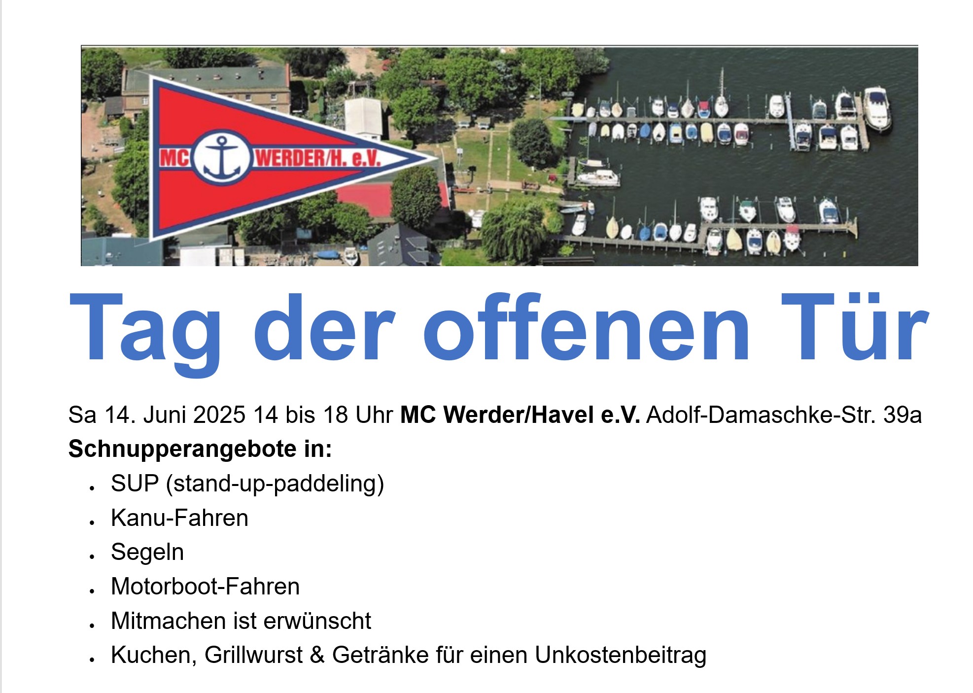 Am Samstag, den 14. Juni 2025, öffnete der MC Werder/Havel e.V. von 14 bis 18 Uhr seine Tore für alle Wassersportinteressierten auf dem Vereinsgelände in der Adolf-Damaschke-Str. 39a.