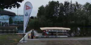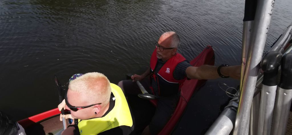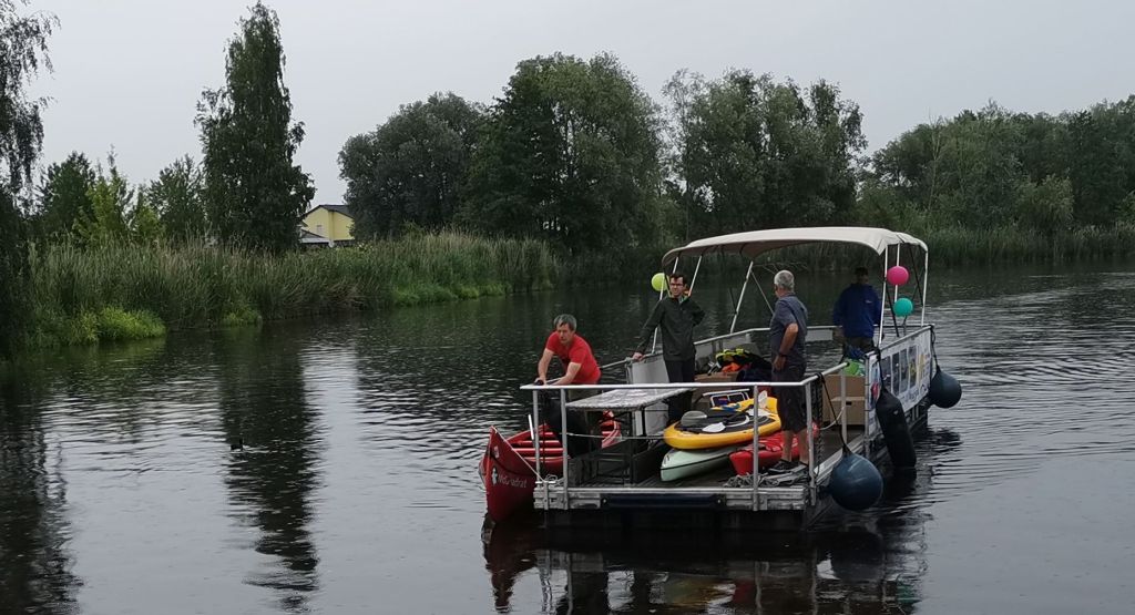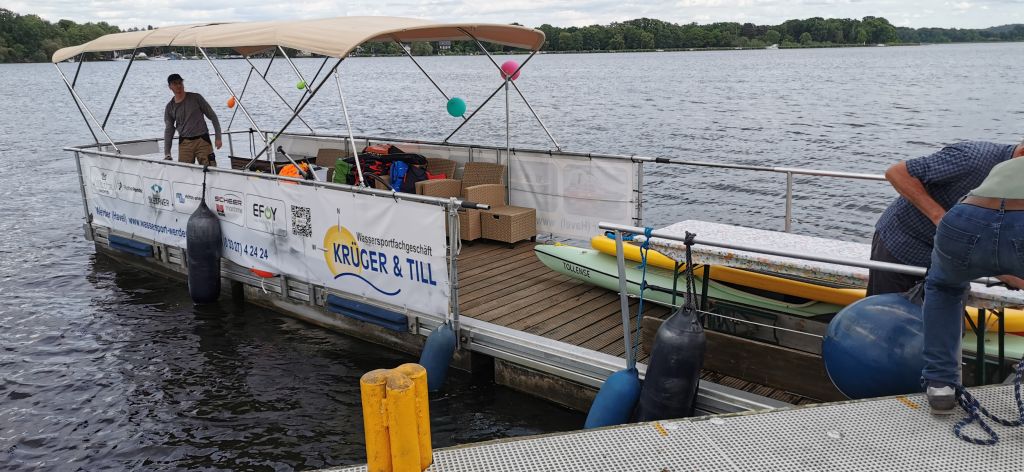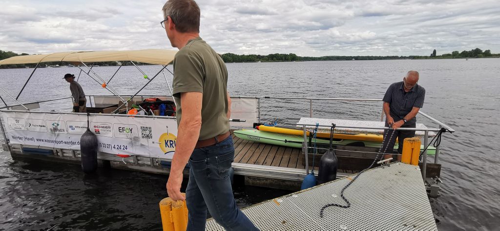 Per, Jan, Olaf und Thomas holten ein großes Floß bei Krüger und Till. Im Verein wurde das große Kanu angebunden und weitere Kajaks aufgeladen. Das Floß wurde in der Havelauenbucht vor der Fußgängerbrücke festgemacht.