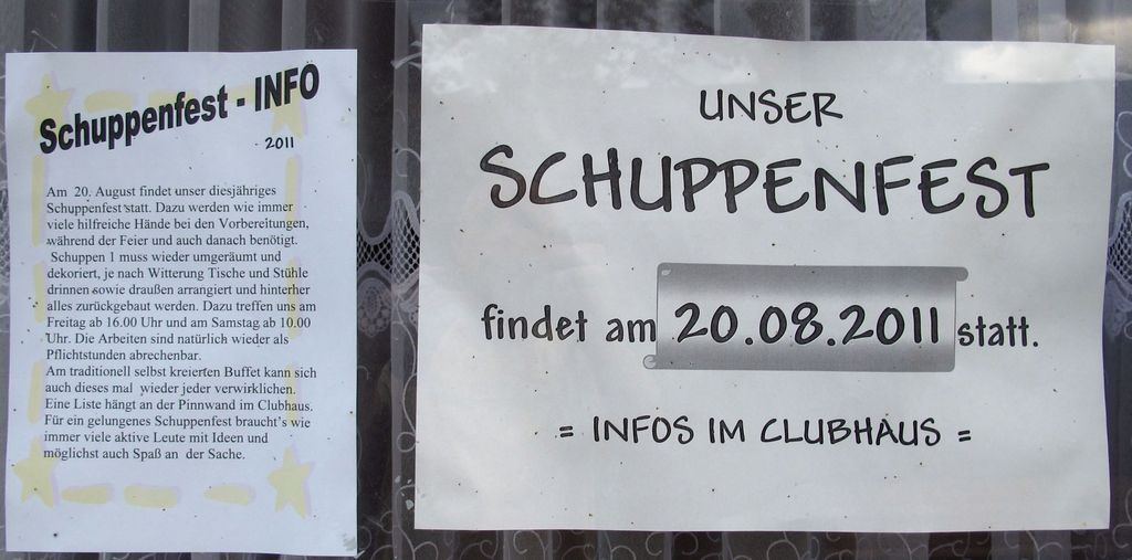 Das 39. Schuppenfest ging seinen gewohnten Gang. Der Schuppen wurde ausgeräumt, geschmückt und mit Tischen, Stühlen, Bar und Buffet versehen. Der Grillmeister und die Disco taten ihre Pflicht. Es gab eine kurze Eröffnungsrede unseres Vorsitzenden. Es wurde gut gegessen in Maßen getrunken und getanzt.