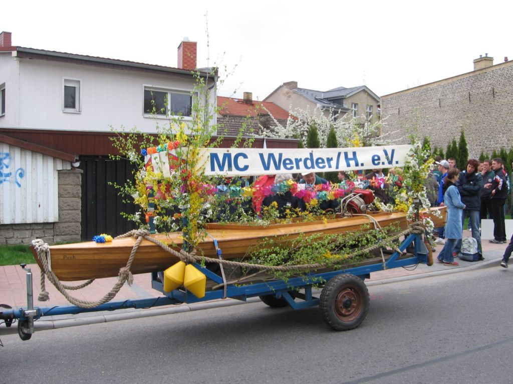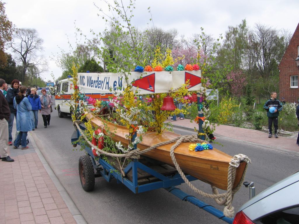 Der MC Werder mit einem sehr schön geschmückten, sehr historischen Holzpaddelbot.