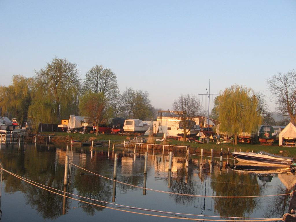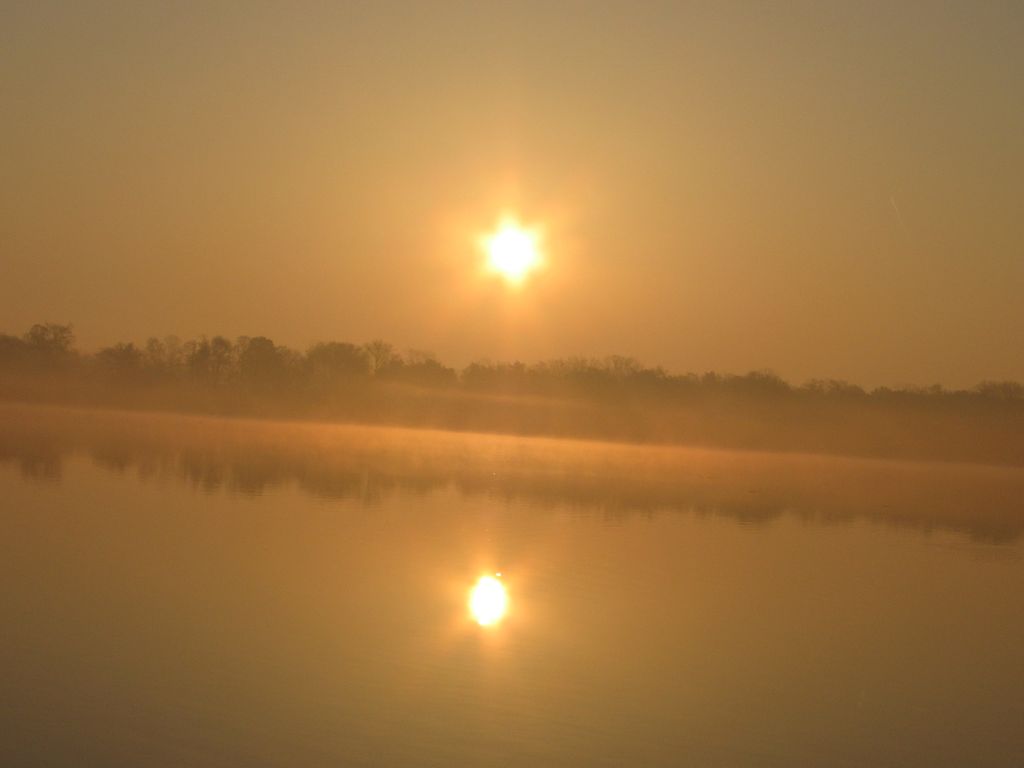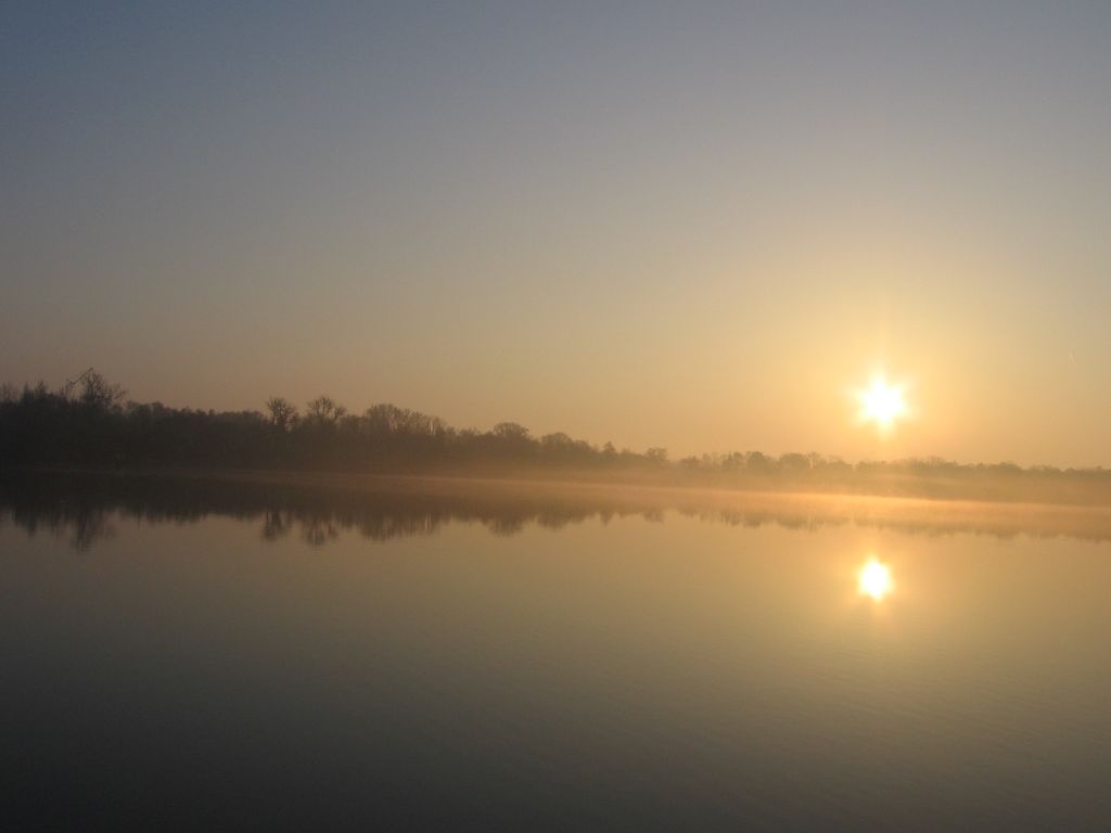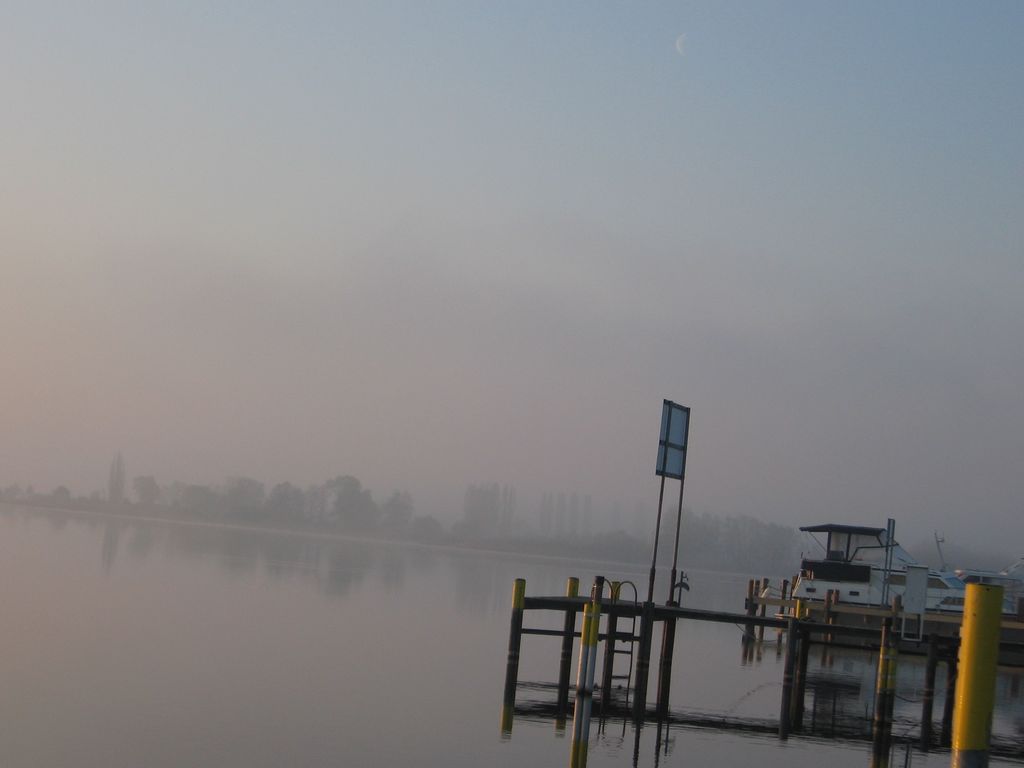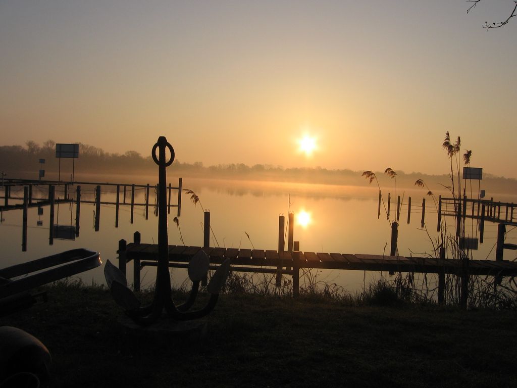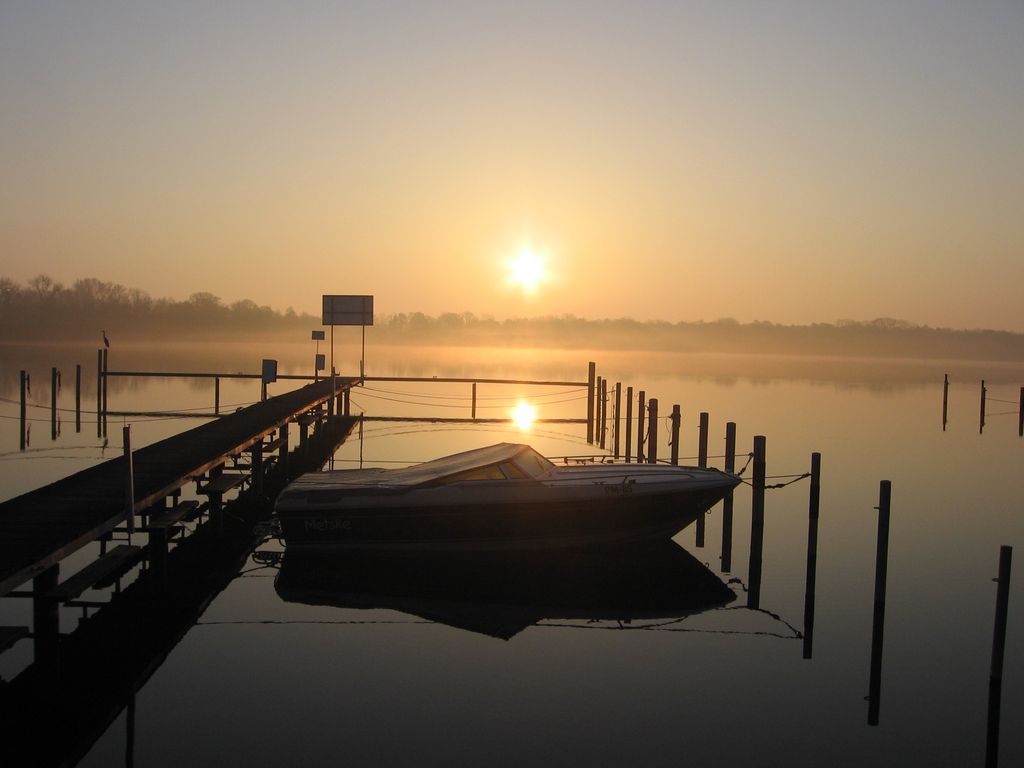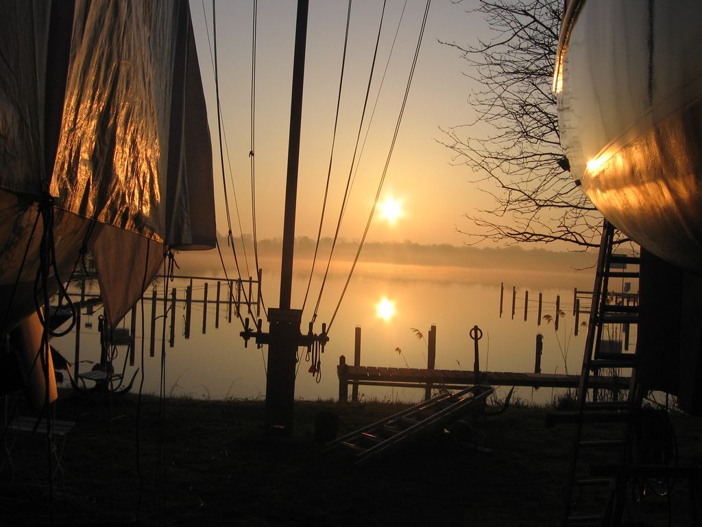 An einem Morgen im April mischt sich der schwindende Nebel mit dem Licht der aufgehenden Sonne und taucht den Bootsplatz in ein seltenes Licht.