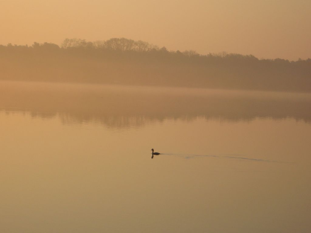 Ein einsamer Haubentaucher zieht zielstrebig vorbei und erzeugt die einzige Welle auf dem spiegelglatten Wasser.