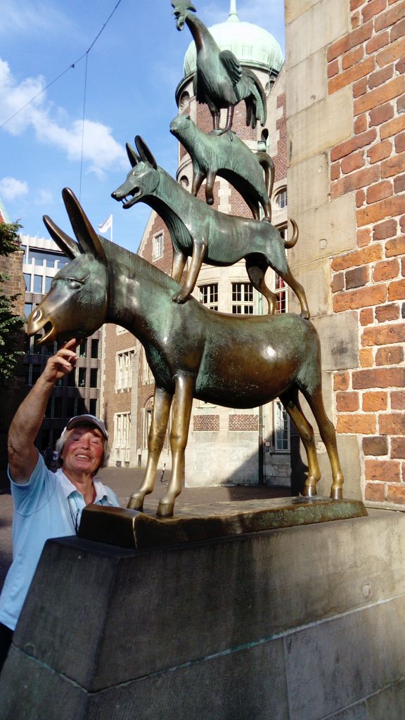 Weiter sollte es zum Dortmund-Ems-Kanal und Mittelland-Kanal gehen, aber Schleuse Meppen legt zwei Wochen Reparaturpause ein. Deshalb über Küstenkanal, Oldenburg die Hunte mit Ebbstrom hinab, bei Elsfleth Stillwasser abgewartet und mit Flut Weser hinauf zu den vier Stadtmusikanten.