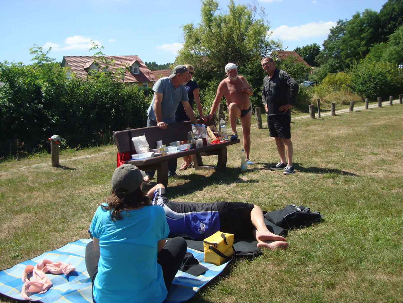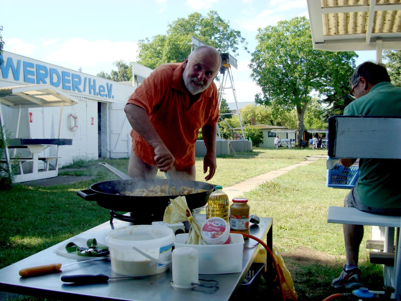 Nach einer lustigen Rücktour zum Bootsplatz des MC Werder/Havel e.V. wurde die sportliche Runde von einem Gast mit vor Ort selbstgemachten Bratkartoffeln und Brathering verwöhnt. Zur Krönung gab es als Nachtisch Eierkuchen. Und das alles unter freiem Himmel - da schmeckt es gleich noch einmal so gut.
