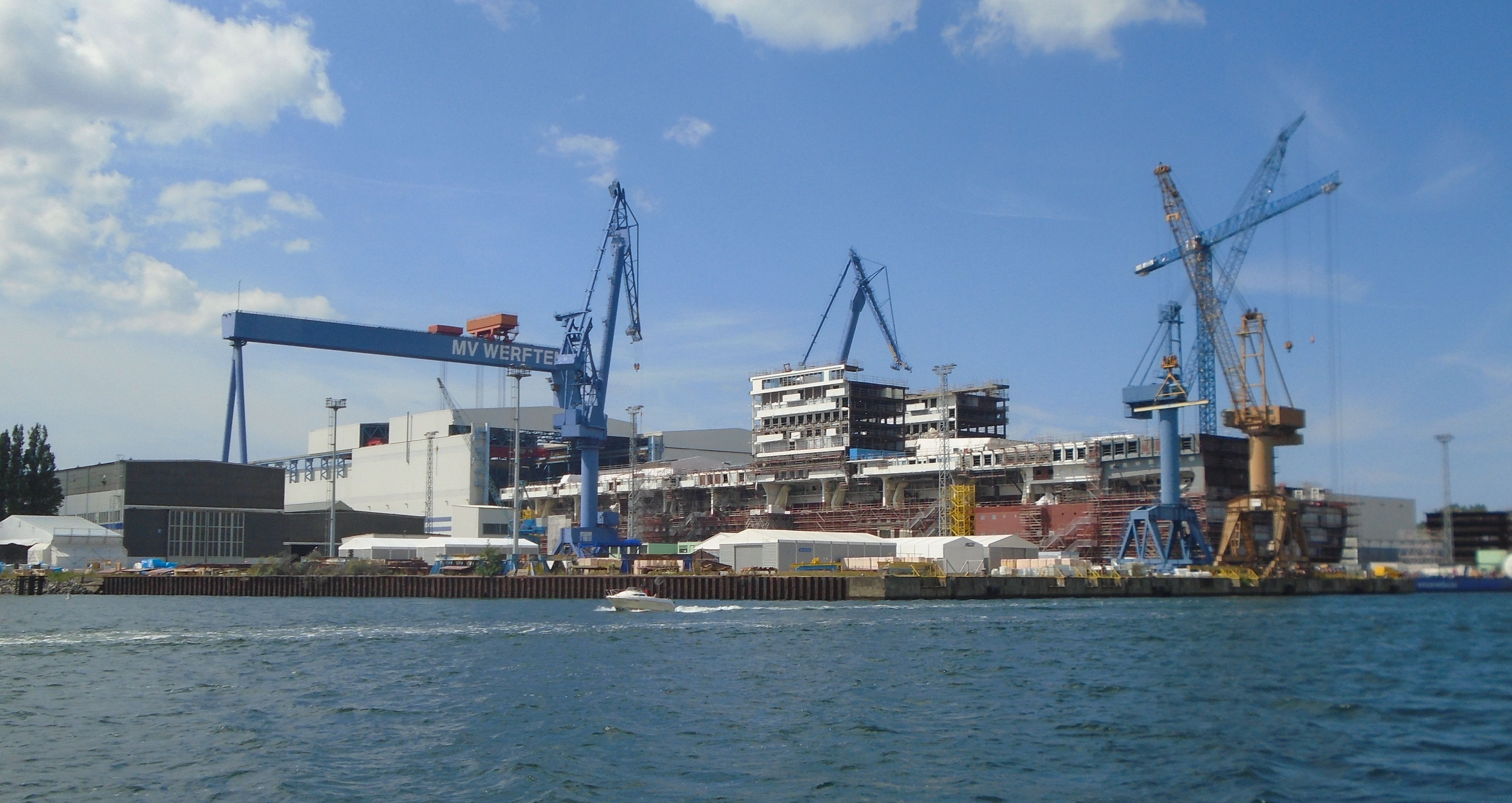 Nach Wetterberuhigung 4h bis Nothafen Darsser Ort und 6 h bis Warnemünde, auf dem Weg nach Rostock vorbei an Neptunwerft mit weltweit grössten Kreuzfahrtschiffneubau, 342 m, 5000 Fahrgäste. Hier wird nur Mittelteil gebaut, passt nicht in Halle, in Wismar Bug und Heck, später hier zusammengefügt, neue Kräne notwendig, Ausbau Bremerhaven, chinesische Reederei, nicht unser Traumschiff, das bleibt weiterhin die Kia Orana.