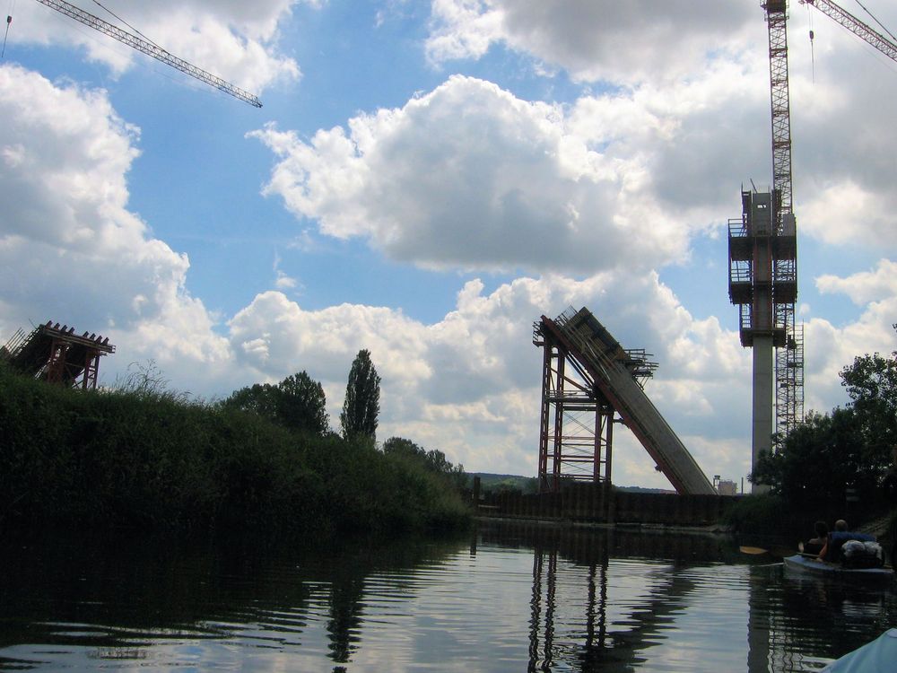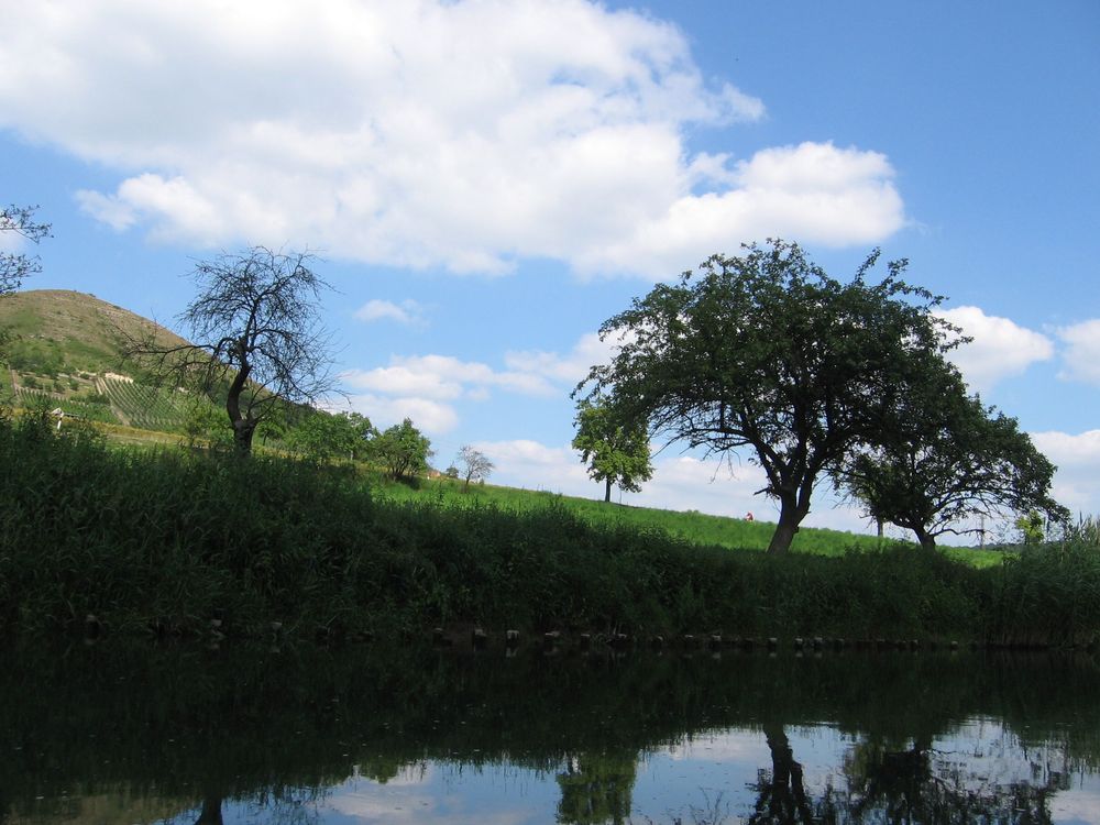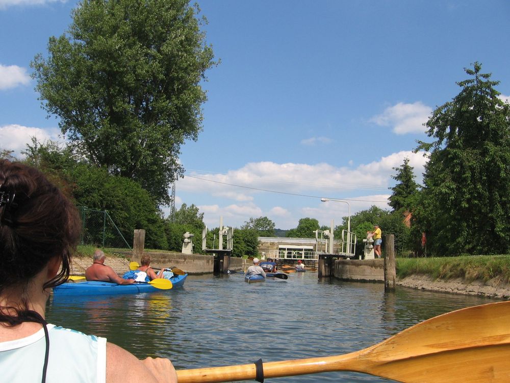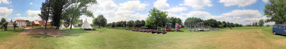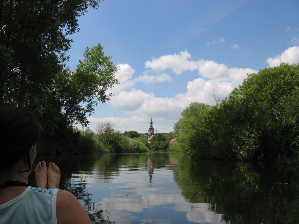 Nach dem Aufbau und zu Wasser lassen der Boote führte uns die erste Etappe mit geringer Strömung durch flaches Land, durch die Schleuse Wendelstein, mit einem Blick auf die Arche Nebra zum Biwakplatz in Reinsdorf bei km 30,5. Dort gibt es außer einer Sitzgruppe keine Bequemlichkeit. Unsere Empfehlung: Schöner ist der Rastplatz Memleben bei Km 40 mit sanitären Anlagen und netter Bewirtung.